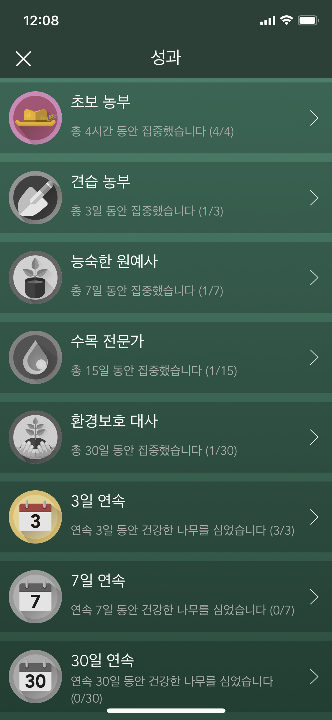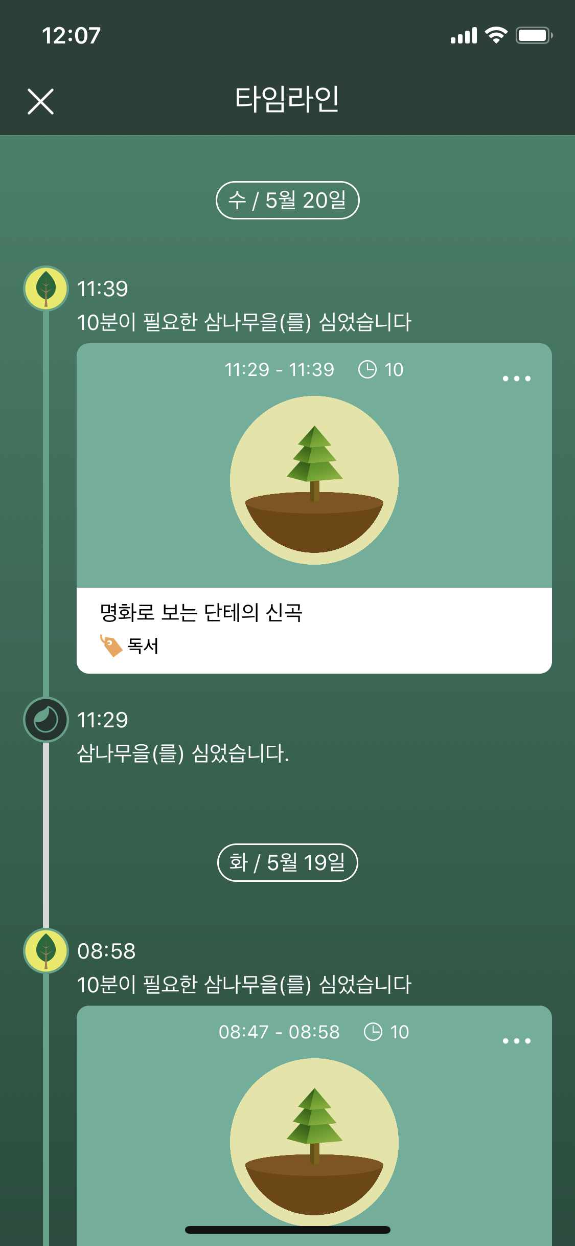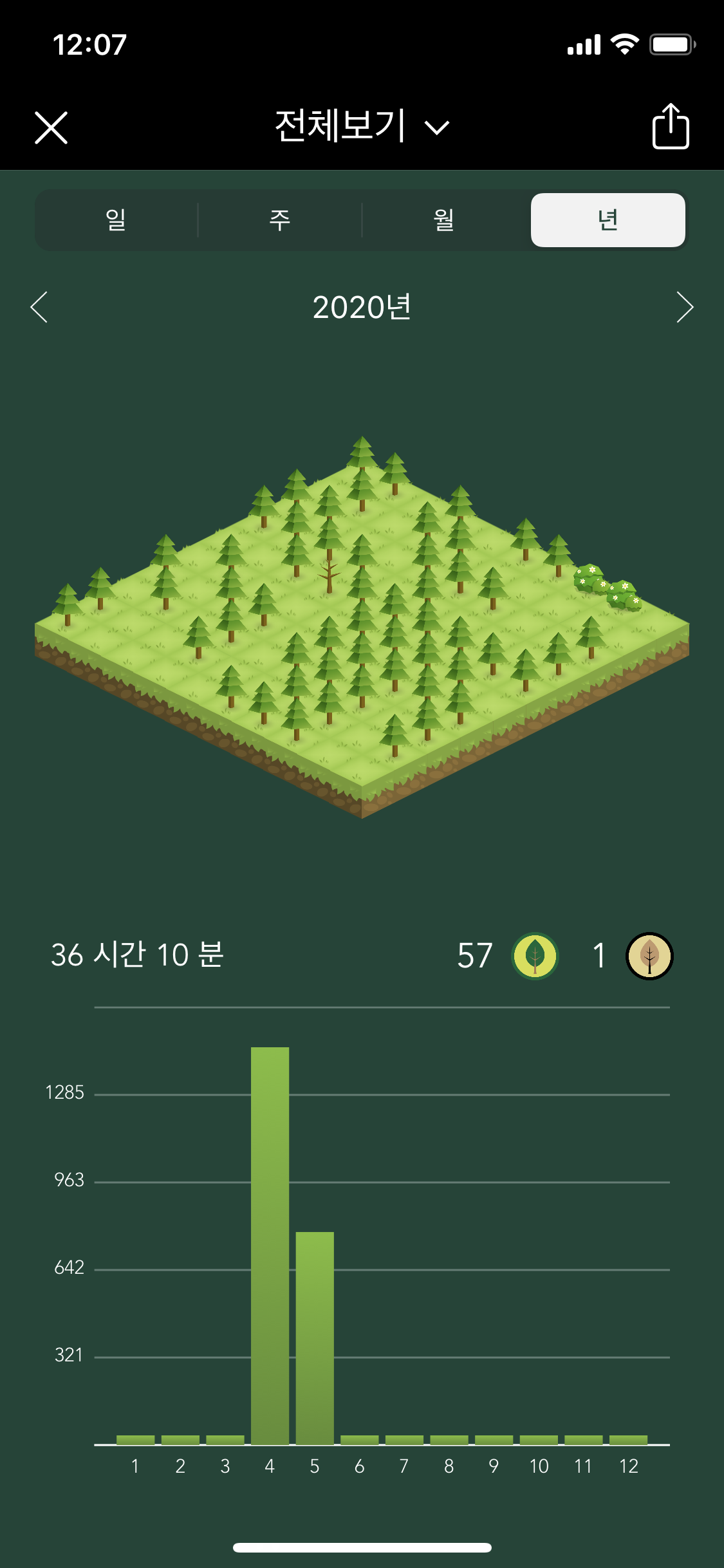 일, 주, 월, 년 단위로 본인의 숲에 얼마만큼의 나무가 심어져 있는지 볼 수 있습니다.