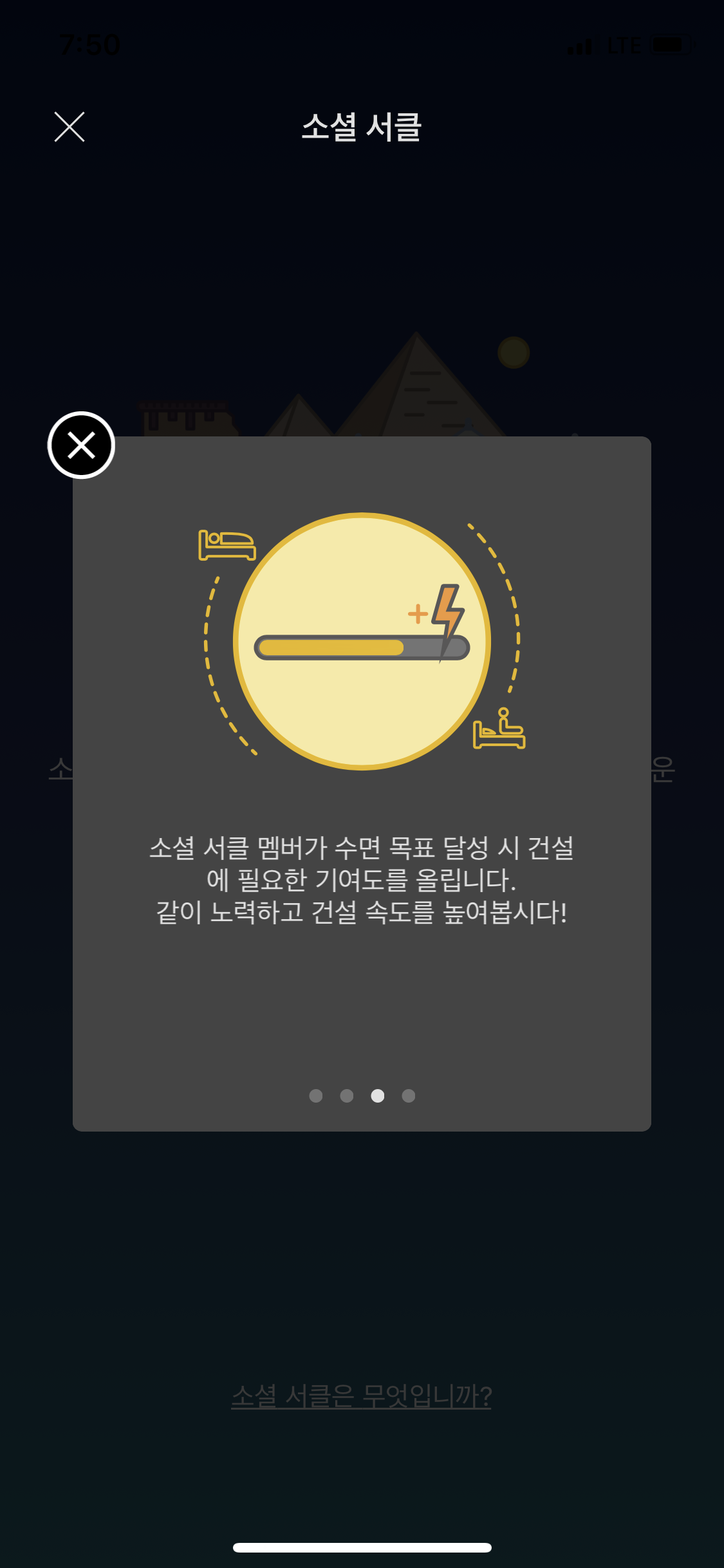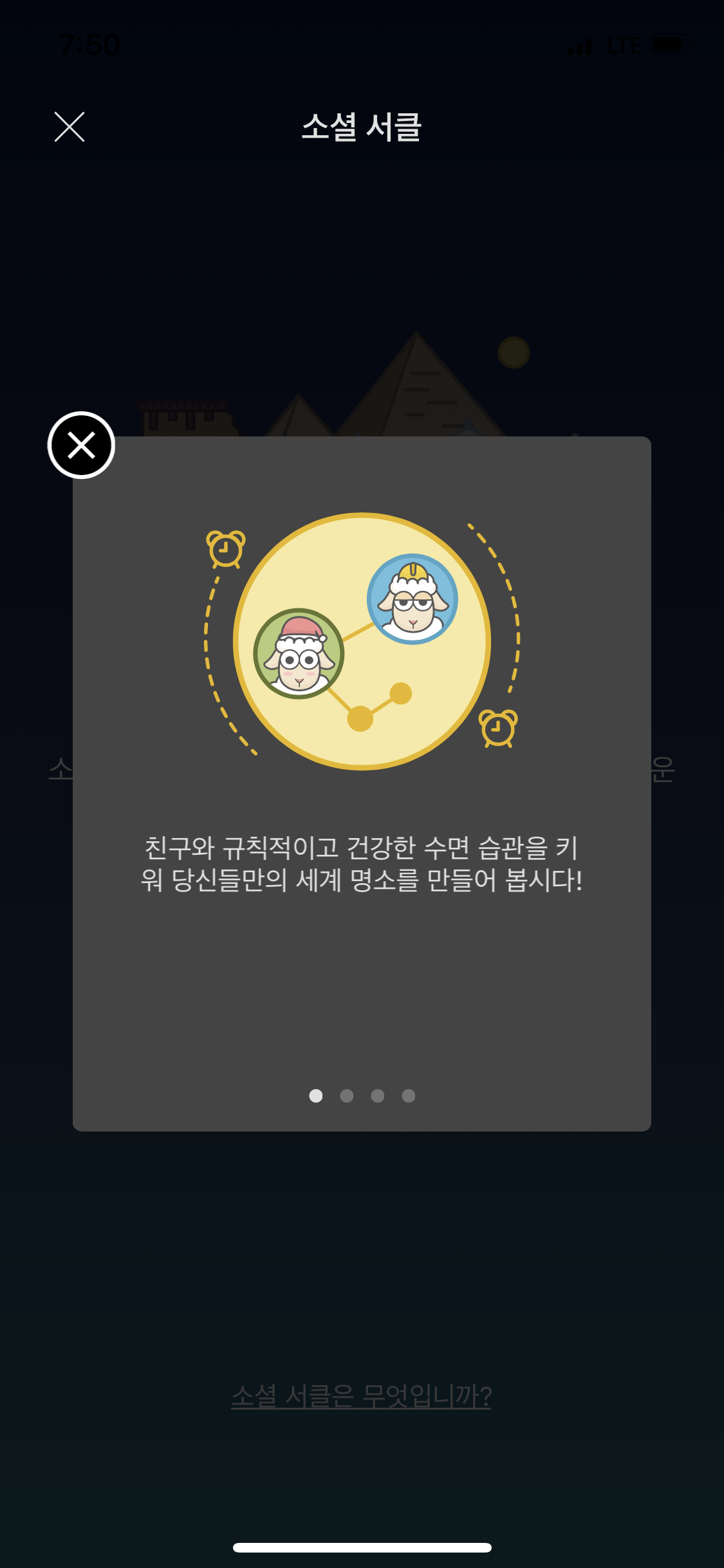 소셜 서클 메뉴입니다. 친구와 함께 건강한 수면습관을 만들 수 있게 도와주는 어플입니다. ㅎㅎ