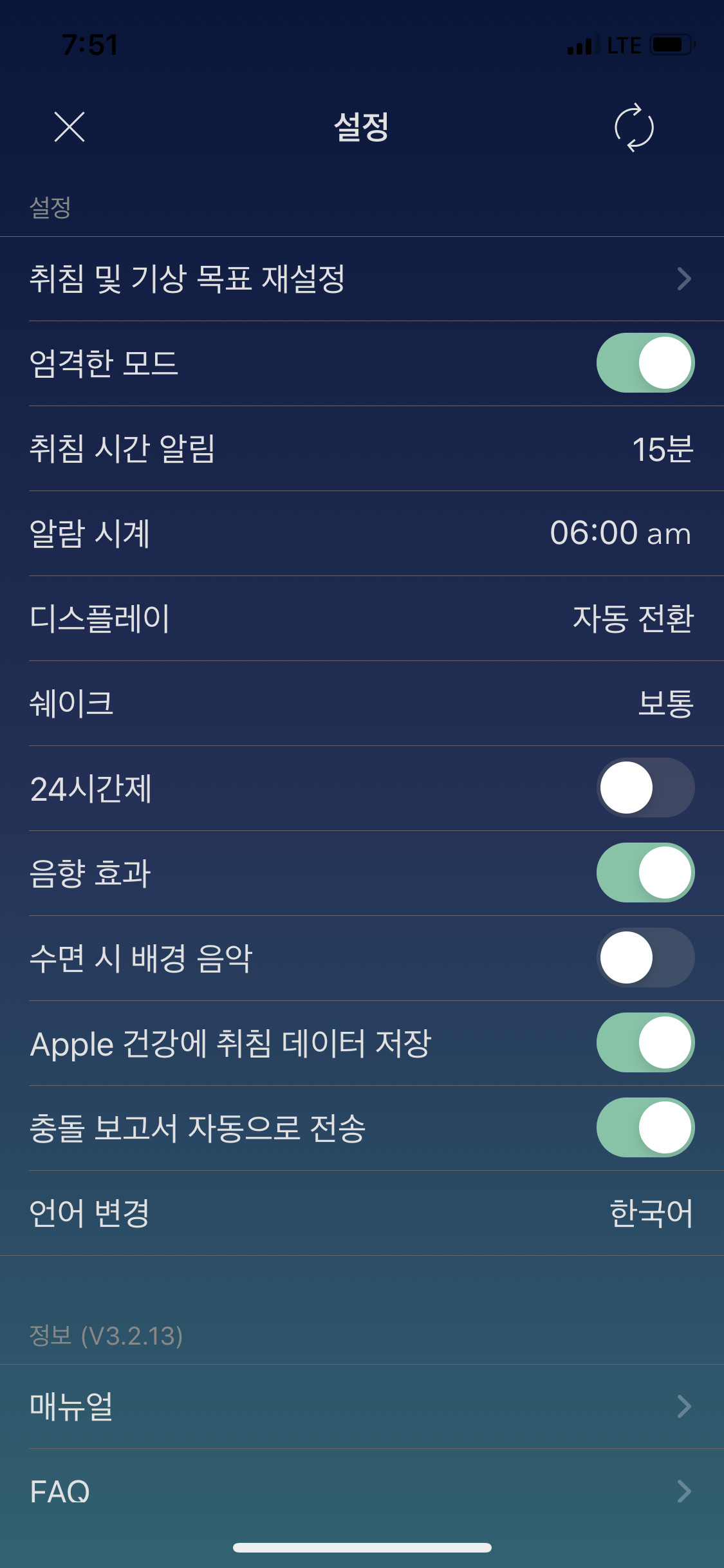 어플을 처음 키면 나오는 화면입니다. 위에 보시다시피 취침 시간 목표와 기상 시간 목표를 설정할 수 있습니다.